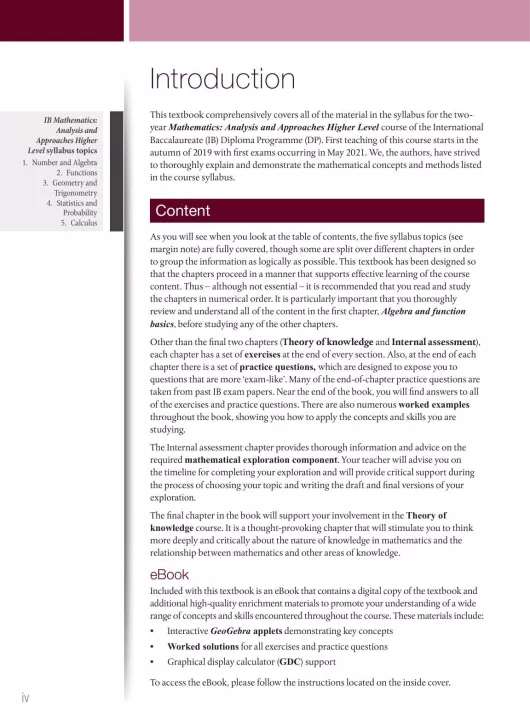 Mathematics Analysis and Approaches for the IB Diploma Higher Level provides comprehensive coverage of the new curriculum, developed for first examinations in 2021. Written by a highly experienced IB author team, this book includes the following features: integrated GeoGebra applets created specifically for the course, worked examples to help you tackle questions and apply concepts and skills, practice questions to help you prepare for the exam, a rich and wide-ranging Theory of Knowledge chapter, and guidance on the Internal Assessment.